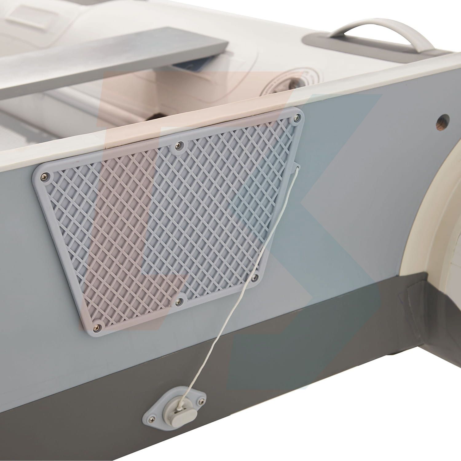 Na dolnej części pawęży pontonu zainstalowano zawór odprowadzający wodę, aby zapobiec jej gromadzeniu się wewnątrz podczas "jazdy" z silnikiem. Jest to istotne zabezpieczenie, które chroni wnętrze pontonu przed wodą, która może dostać się do środka na skutek fal i bryzgów. Dzięki temu rozwiązaniu, nawet podczas intensywnego użytkowania pontonu, jego wnętrze pozostaje suche, co zapewnia bezpieczeństwo i komfort użytkowania.